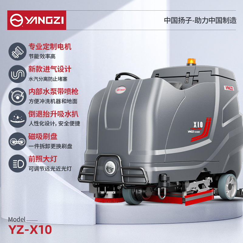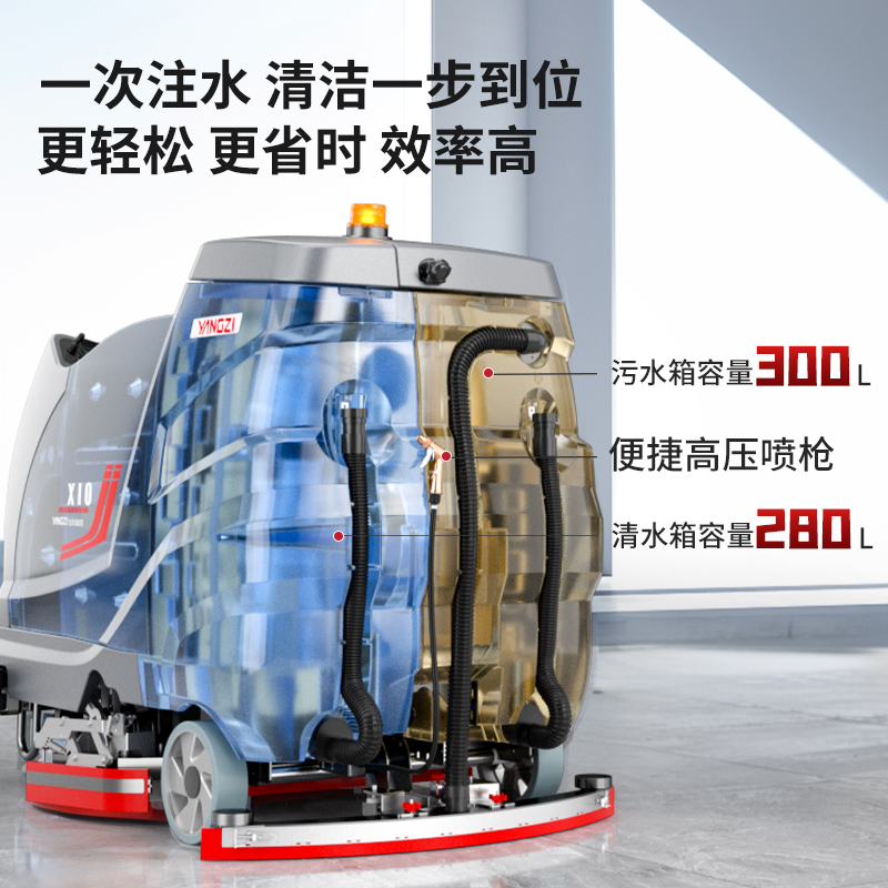 揚(yáng)子YZ-X10大型駕駛式洗地機(jī),1次充電續(xù)航7-8H,配置高壓水槍清潔頑固污漬,智能集成儀表清潔過(guò)程得心應(yīng)手。